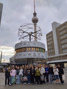 Am 29.09. machten sich die 9a mit Herrn Püttner und Frau Schindler auf nach Berlin. Die Anreise mit dem Zug war relativ entspannt, auch wenn die Sitzplatzsuche nicht immer erfolgreich verlief. Angekommen in der Hauptstadt wurde ein kurzer Stop im Jugendhotel eingelegt, bevor wir mit der S-Bahn weiter zum ersten Baustein, der Ausstellung zur „Topographie des Terrors“ fuhren. Anschließend führte uns Herr Püttner zum bekannten Checkpoint Charlie, wo sich alle umsehen und stärken konnten.